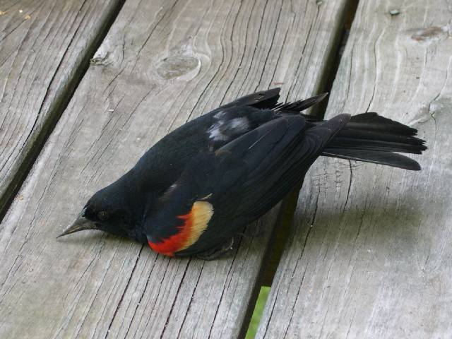 This one was downed by a fullspeed collision with the glass doors to the deck, a fairly frequent occurance. He recovered and flew off after about 10 minutes.